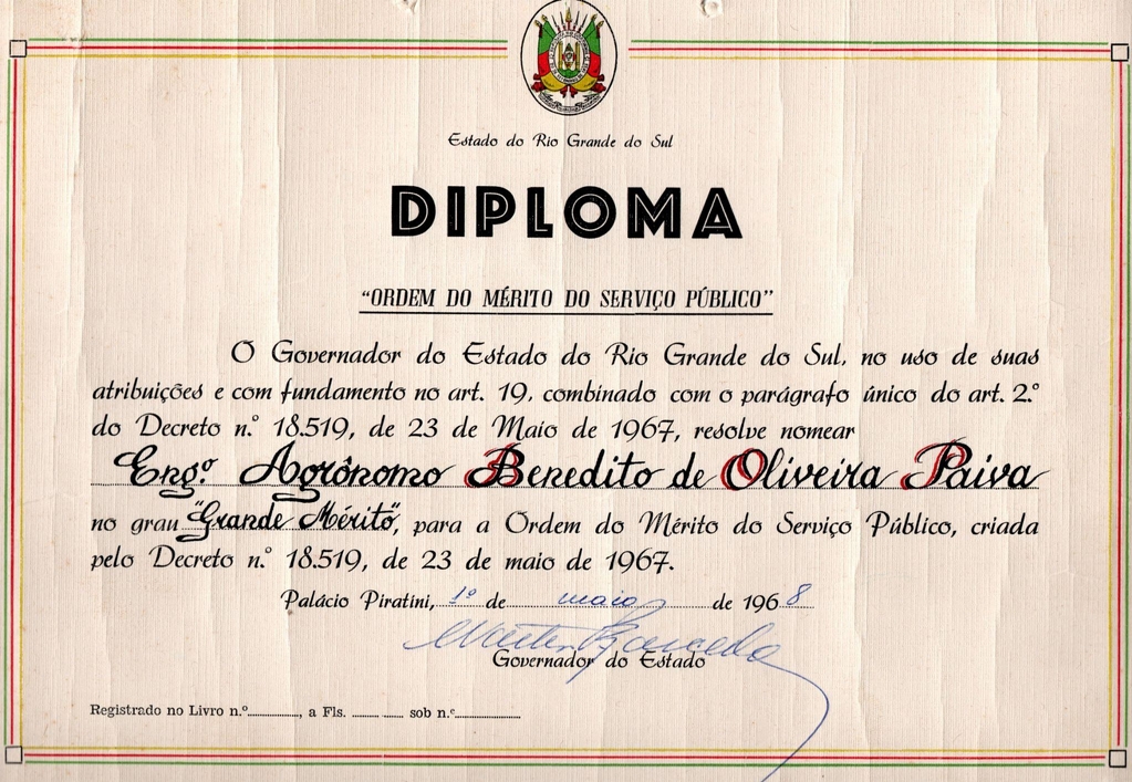 Em 1967, o Dr. Benedito recebeu a Louvação do governador do Rio Grande do Sul, Ildo Meneghetti (Portaria n. 47/67, 20/01/1967), em reconhecimento aos relevantes trabalhos de pesquisa para o desenvolvimento da cultura do trigo e pela criação da cultivar Toropi, em 1965 (Cunha e Paiva, 2000). No ano seguinte, em 1968, foi novamente condecorado pelo Governo do Estado com a “Ordem do Mérito do Serviço Público”. Essa trajetória de reconhecimento somava-se à sua atuação anterior como avaliador, tendo integrado a comissão julgadora da 1ª Exposição de Produtos Agrícolas do Estado de Minas Gerais, em julho de 1937, e a comissão da Exposição do Centenário Farroupilha, em 1935, na categoria de gramíneas.