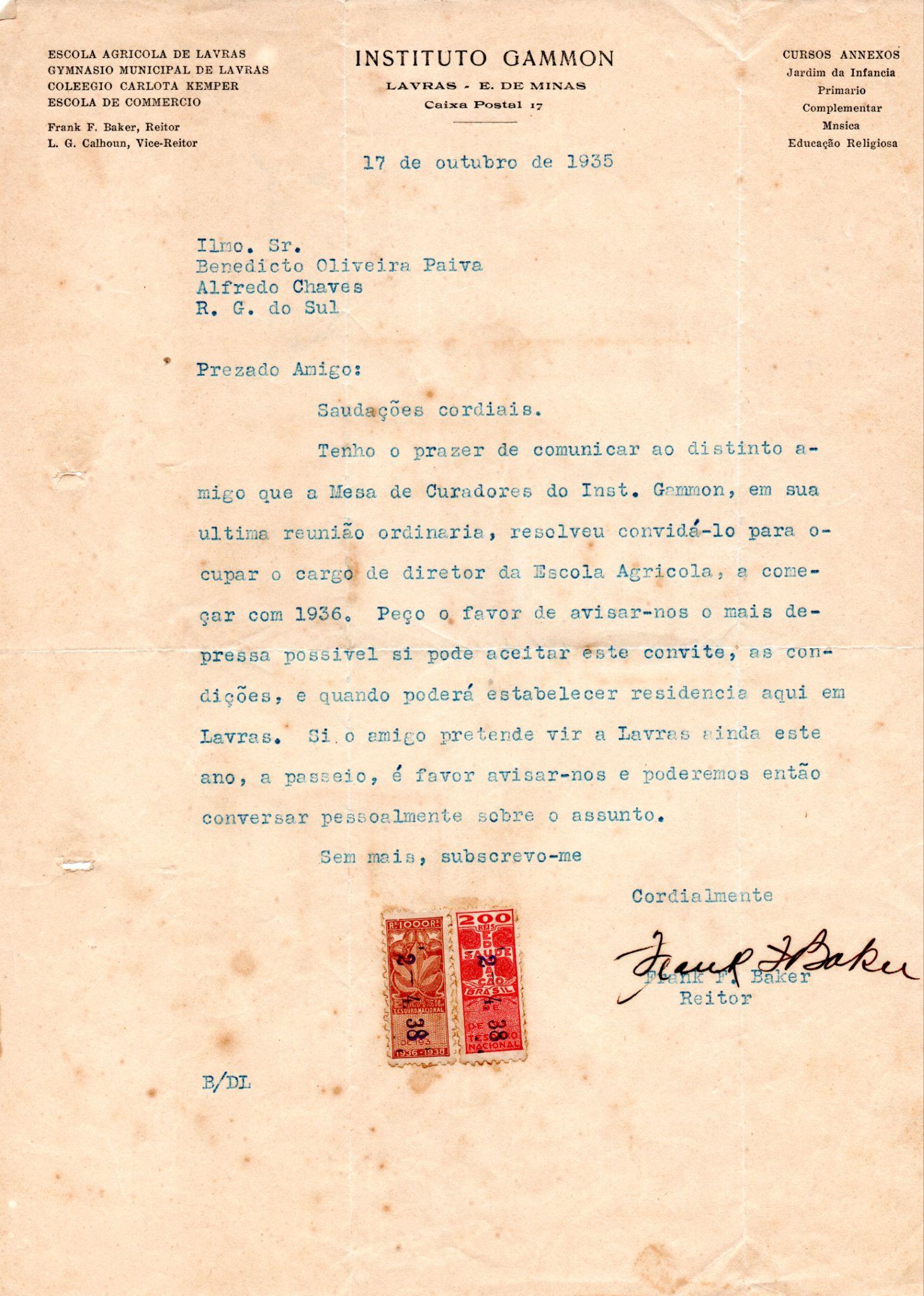 Benedicto de Oliveira Paiva nasceu em 12 de novembro de 1889, em Sant’Ana de Pirapetinga-MG, filho de Augusto de Oliveira Paiva, que era ferroviário, e de Bellisa Fontes Paiva. Aos 18 anos, foi para o Rio de Janeiro e conseguiu emprego no jornal “O Puritano”. Sua história com Lavras e com a Escola Agrícola de Lavras (ESAL) se entrelaça de modo decisivo com o auxílio do Rev. Américo de Menezes, que intermediou a sua entrada para estudar no Instituto Evangélico (atual Instituto Presbiteriano Gammon). Mesmo com a situação difícil, inclusive para adquirir itens básicos como lápis de escrever, era só o começo do êxito de Benedicto na educação.